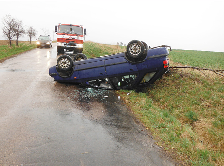 Dobrá Voda u Hořic (dopravní nehoda, 17.14) - Hořická profesionální jednotka hasičů zasahovala u dopravní nehody osobního vozidla, které havarovalo na komunikaci mezi Dobrou Vodou u Hořic a obcí Lískovice. Automobil skončil z větší části mimo vozovku na střeše. Jeden člověk z posádky byl zraněn a byl převezen do zdravotnického zařízení. Hasiči zabezpečili místo zásahu i havarované vozidlo, policisté vše zadokumentovali. Jednotka pak převrátila vůz zpět na kola s tím, že ho zajistila proti vzniku požáru. (foto)