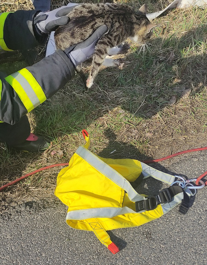 Svatojanský Újezd (záchrana zvířete, 9.23) - Dalším zachráněným zvířetem bylo v pondělí kotě, které spadlo do kanálového otvoru. Díra byla asi tři metry hluboká s průměrem 40 cm. Na pomoc s vyproštěním přijela profesionální jednotka z Hořic. Hasiči spustili do kanálu evakuační záchranářský trojúhelník, ve kterém pak kotě vytáhli a předali majiteli.